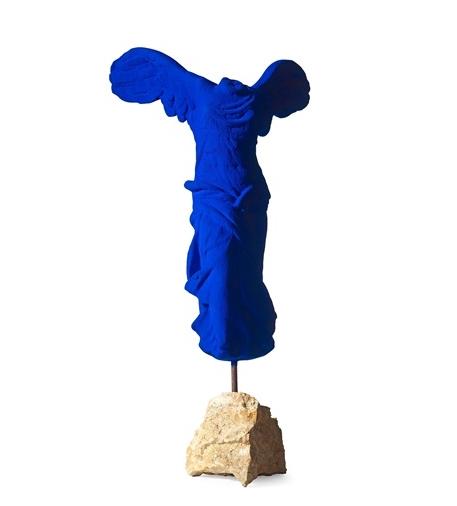 Yves Klein was the most influential, prominent and controversial French artist to emerge in the 1950s, chiefly noted for artwork in his patented rich ultramarine pigment, International Klein Blue (IKB). Inspired by his studies and travels through Europe, Klein created his version of La Victoire de Samothrace (Winged Victory of Samothrace), also known as the Nike of Samothrace, a marble sculpture from the Hellenistic period of 2nd century BC. One of the most celebrated sculptures in history and a staple in the Louvre collection since 1884, the work commemorates the triumph of a naval victory in the 2nd Century. The sculpture depicts a dramatic moment of action and triumph through its forceful sense movement and billowing drapery. In 1962, Yves Klein, who is recognized for his signature blue monochrome paintings, produced a series of works that appropriated famous sculptures in history and rendered them in his patented “International Klein Blue” pigment, most notably the exquisite La Victoire de Samothrace.