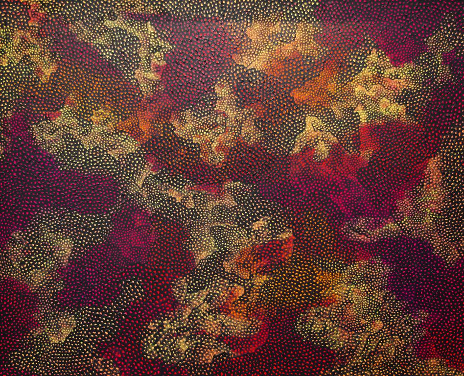 Yayoi Kusama’s stunningly complex Infinity Net paintings are her most celebrated series. The iconic works are characterized by intricate surfaces of small painted arches covering the ground of the canvas, like the details lattice or lace. Infinity Nets underlay is a wash of bright reds, oranges and yellows, obscured by the gestural net form. The black nets stretch across the surface of the painting and extend beyond the picture plane into infinity. Kusama’s first net paintings were produced in the 1950s and 1960s, and are inspired by her own recurring hallucinatory visions where her entire visual field is obscured by nets and dots. The net composition produces biomorphic shapes that come in and out of focus, suggesting cosmos, cells or atoms, enveloping the viewer, just as they envelope Kusama.